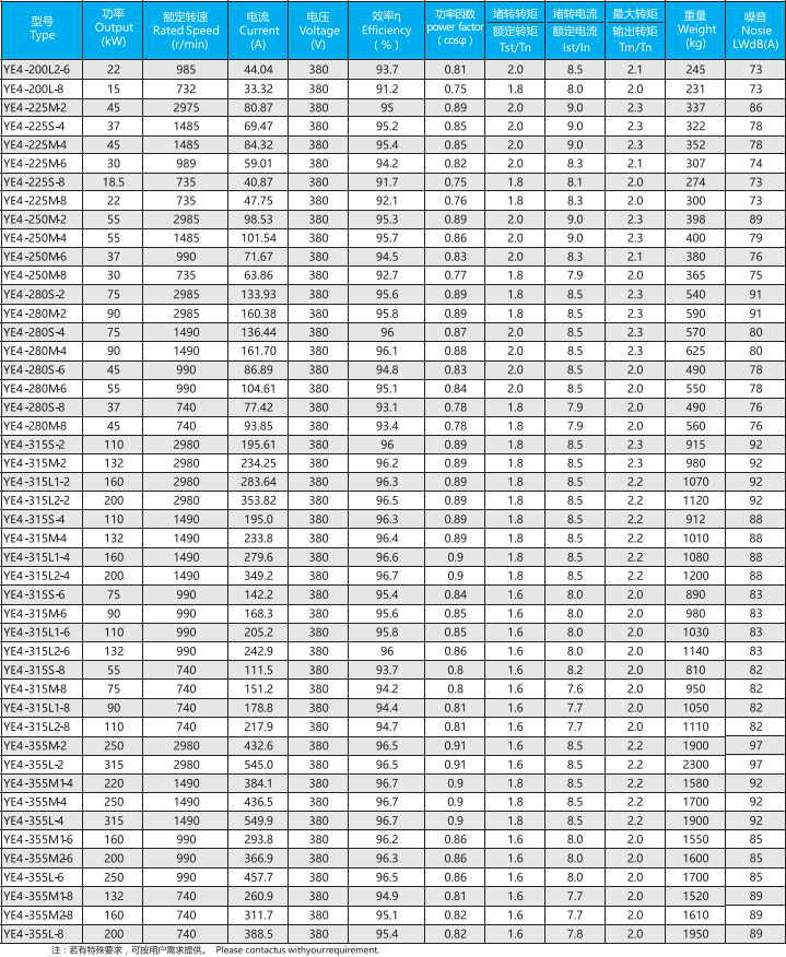YE4系列(中心高H80-355mm、0.55-375kW)電動機是全封閉、自扇風(fēng)冷式鼠籠型三相異步電動機,產(chǎn)品能效與IEC60034-30的IE4保持一致。一般電壓為380V、頻率為50HZ也可按客戶要求定制。工作環(huán)境-15-40℃海拔不超過1000m,絕緣等級F(B極考核)、防護等級IP55、冷卻方式IC411、工作制S1、安裝方式符合IEC和DIN標(biāo)準。YE4系列電動機為一般用途的電動機,適用于驅(qū)動無特殊要求的各種機械設(shè)備。YE4系列電動機滿足GB18613-2020能效限值2級。