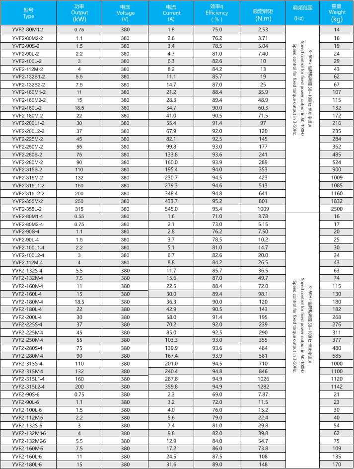 YVF2系列電機是可以采用變頻器供電的三相異步電動機,是電機節(jié)能的一種典型應(yīng)用,采用特殊的絕緣系統(tǒng)吏其能適用于變頻器供電系統(tǒng),一般額定電壓380V,頻率50Hz,5~50Hz為恒轉(zhuǎn)矩,50~100Hz為恒功率,也可根據(jù)用戶要求確定額定點的電壓和頻率,防護(hù)等級IP55、冷卻方式IC416、安裝方式符合IEC和DIN標(biāo)準(zhǔn)。